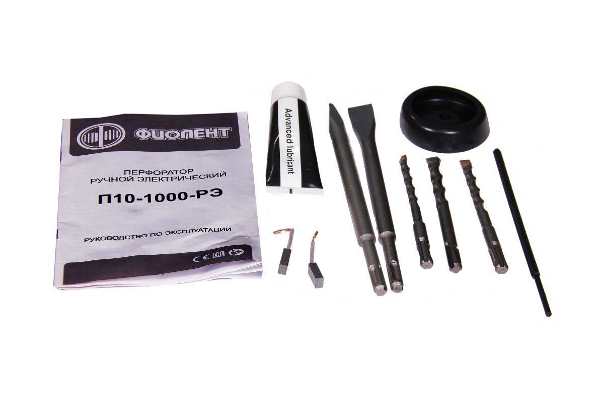 - Расширенная комплектация изделия: перфоратор ручной электрический, пылеулавливатель, пруток, сверло (8, 10, 12 мм.), пика, зубило, смазка, кейс, дополнительный комплект щеток, руководство по эксплуатации;